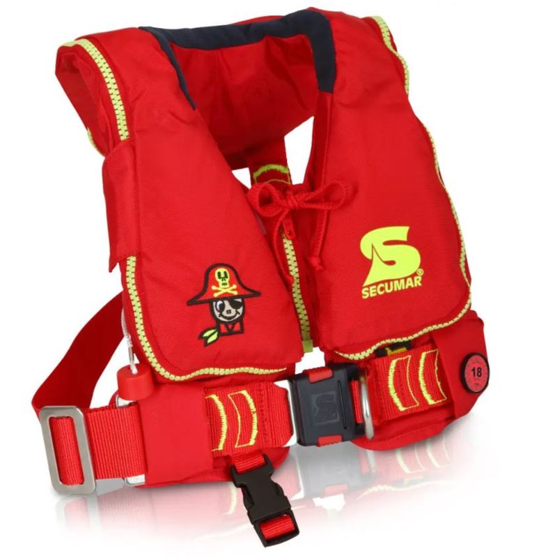 150N inflatable lifejacket for small children (15–30 kg), approved to DIN EN ISO 12402-3. New Winglet swim bladder with double layer system for double safety. Handle on back. Front D-ring. Triple secure closure: zip, tie strap, click buckle!
